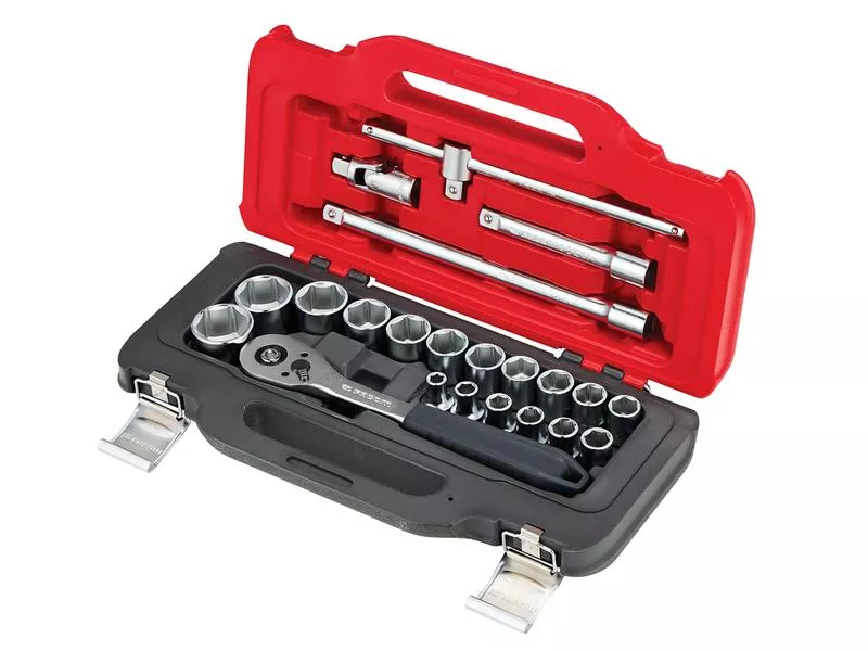 22 Piece SL.151-EP22PB Facom 1/2in Drive Socket Set in TWIN BOX case. The integrated ergonomic handle ensures easy and comfortable transport, both in the workshop and on the go. Made from highly resistant, textured plastic with sturdy metal latches. Contents:
