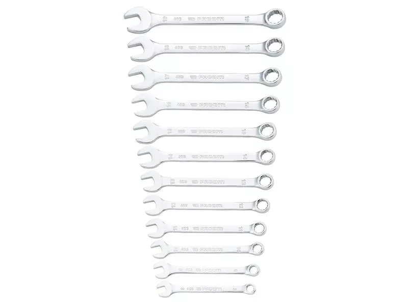 12 Piece Facom 40B.JP12PB 40B Series Slim Metric Combination Spanner Set. The 12-point OGV® profile provides more effective contact between the ring and the nut, better torque transmission, reduced risk of slipping, and longer service life. The ring end is offset by 15° for finger protection and safer, more comfortable work on flat surfaces.