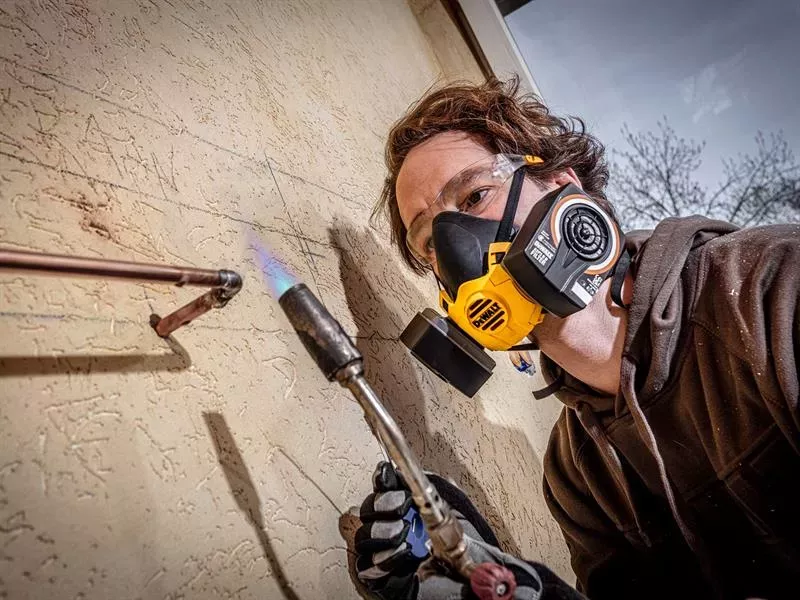 DEWALT Reusable Half Mask Respirator with A2P3 filters. Provides protection in workplaces which have high levels of fine dust, lead, silica, MDF particles, or other forms of industrial pollutants in the air.