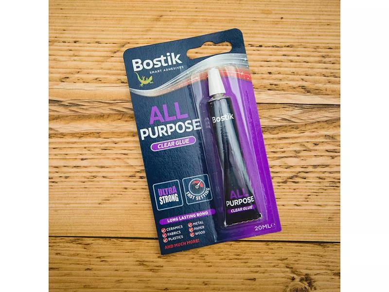 Bostik All Purpose is an ultra strong, quick drying, solvented, clear adhesive. It sticks a range of materials, including ceramics, fabrics, plastics, metal, paper, wood, glass and more! All Purpose is perfect for general household, craft and office use.
