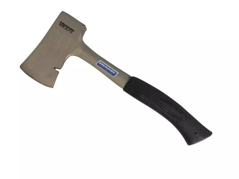 The Vaughan AS114 Camping Axe is made from solid steel with a polished head and handle. It has a flat striking face with bevelled edges and a nail slot in its blade.