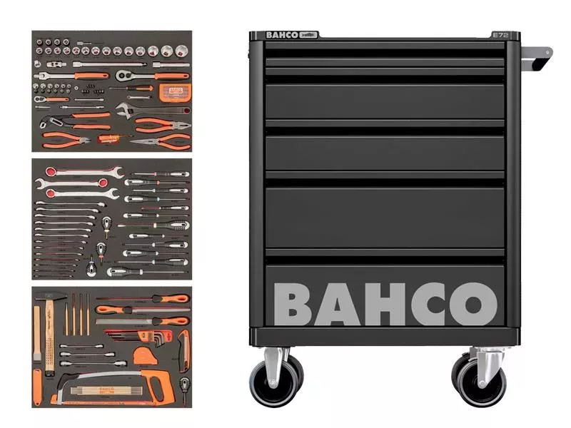 The Bahco E72 Tool Trolley has 5 fully opening drawers with ball-bearing slides that glide very smoothly and have a capacity up to 30kg. It has a sturdy steel dual-walled case construction. The dual-walled case ensures that the drawers still open after collision damage to the outer wall. A scratchproof powder coating outside and inside ensures high protection against rust.