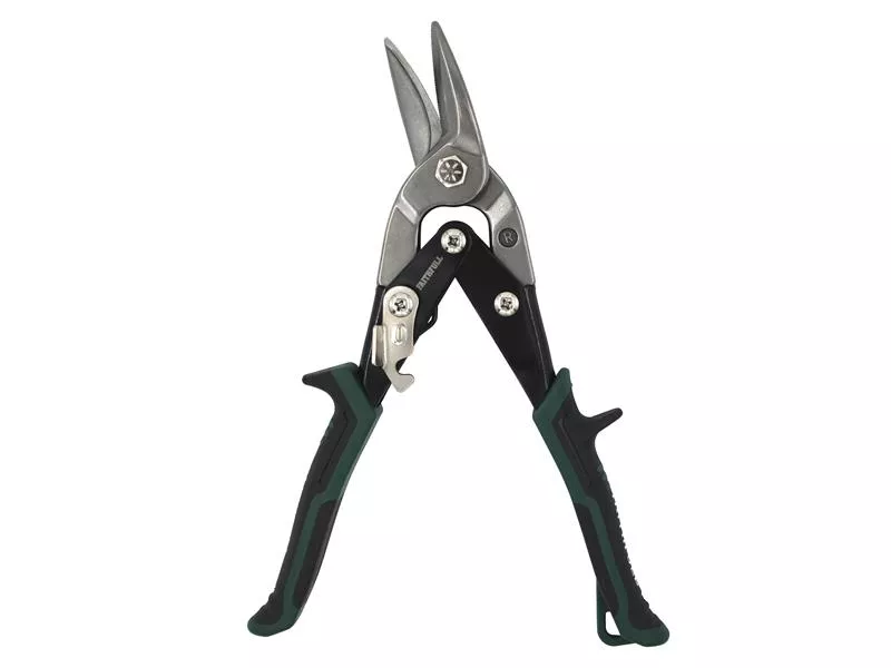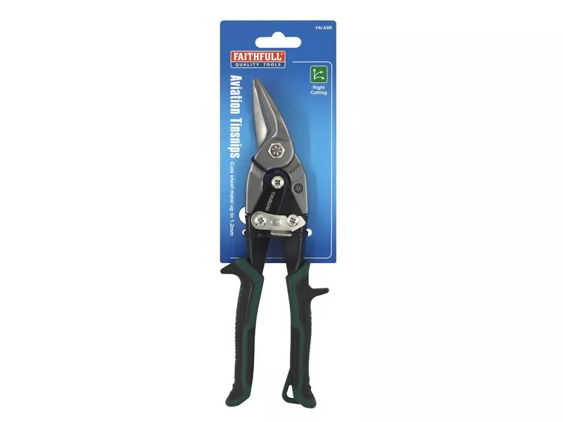 These Faithfull Compound Aviation Snips are crafted to high standards, featuring a safety locking latch, a robust opening spring, and slip guards on each handle for enhanced protection. Made from Cr-Mo, they are capable of cutting up to 1.2mm sheet steel, non-ferrous materials, vinyl, plastic, and rubber. The satin-finished blades are serrated to prevent slipping, and the double fulcrum compound cutting action ensures effortless power delivery.