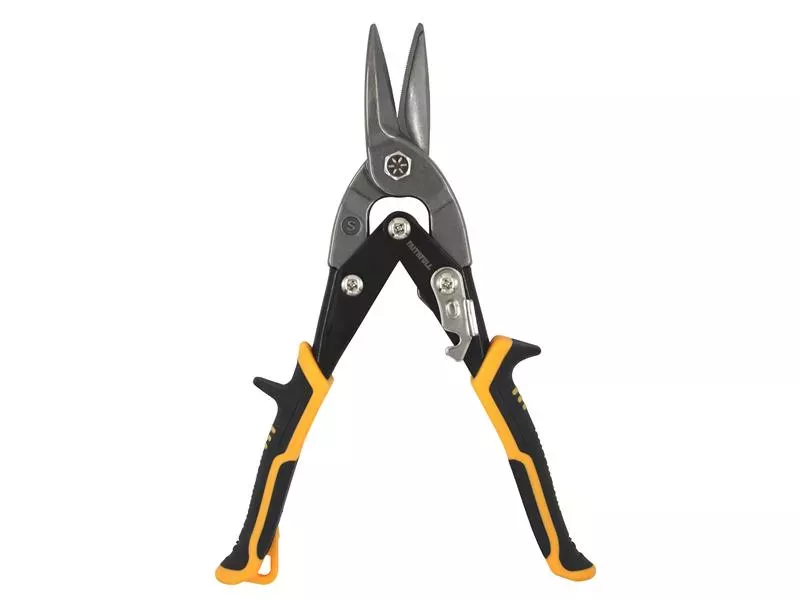 These Faithfull Compound Aviation Snips are crafted to high standards, featuring a safety locking latch, a robust opening spring, and slip guards on each handle for enhanced protection. Made from Cr-Mo, they are capable of cutting up to 1.2mm sheet steel, non-ferrous materials, vinyl, plastic, and rubber. The satin-finished blades are serrated to prevent slipping, and the double fulcrum compound cutting action ensures effortless power delivery.