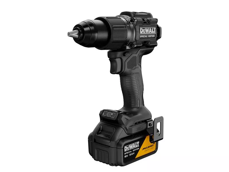 Special Edition DEWALT DCD86MP1T McLaren F1 Combi Drill with a brushless motor for increased power and faster application speed. The E-Clutch detects the motion of the tool and shuts it down in a bind up situation. Increases user safety. Its 15 position adjustable torque control provides consistent screw driving into a variety of materials.