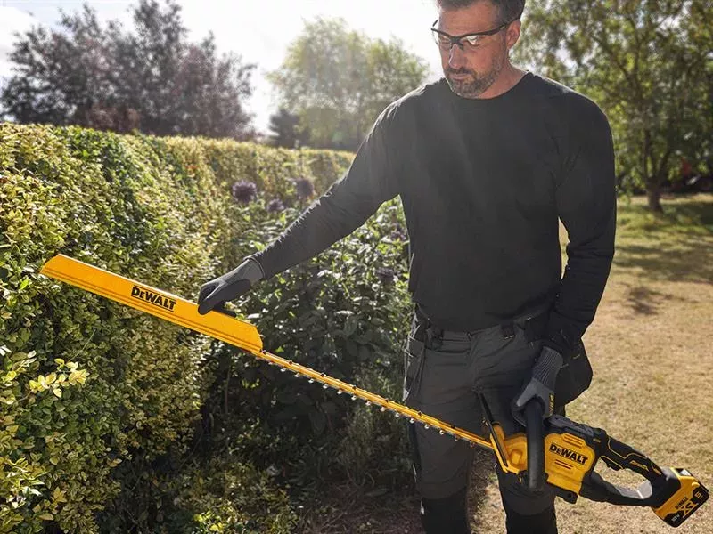 The DEWALT DCMHT567 XR Hedge Trimmer is ideal for larger hedges and shrubs. Its brushless motor provides increased run time and more efficient power transfer. Fitted with dual action, laser cut blades, made from hardened steel for longer life and lasting sharpness. Its compact, lightweight design helps minimise user fatigue, whilst the wraparound auxiliary handle provides a comfortable grip in multiple orientations.