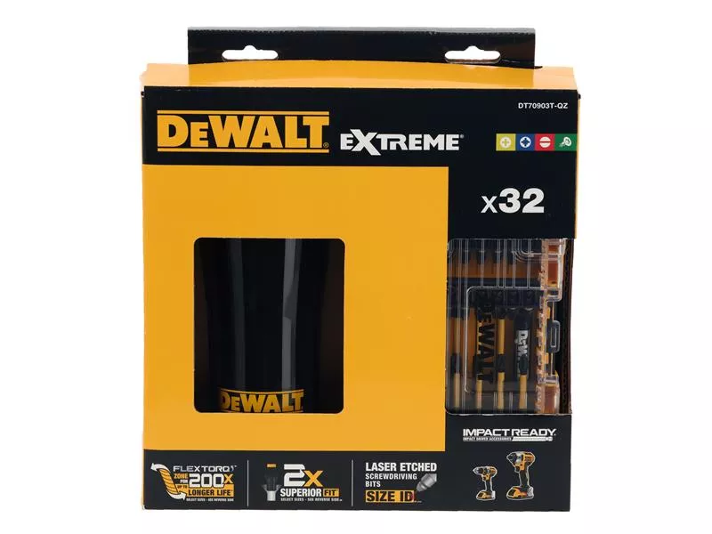 The DEWALT DT70903T FLEXTORQ™ Bit Set contains a selection of EXTREME® FlexTorq™ screwdriving bits engineered for longer life. The built-in torsion zone has been designed to absorb and control high-impact forces, transferring them into the optimised geometry of the bit tip. Reducing the load on the driver and fastener, means secure fixing with longer life. The full fit head eliminates wobble and screw head rounding.