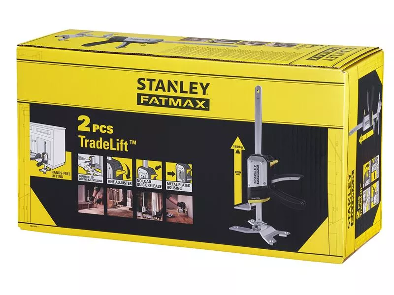 The STANLEY® FatMax® Tradelift™ with push down lever, allows the user to push down on the handle for easier lifting of heavy loads vs a trigger style mechanism. 8mm per stroke. There is also an incremental lowering tab lowering the lift plate 2.5mm per toggle for fine adjustments. Fitted with an overmould handle for improved comfort and grip. A recessed full release acts as a safety feature preventing accidental activation of full release.