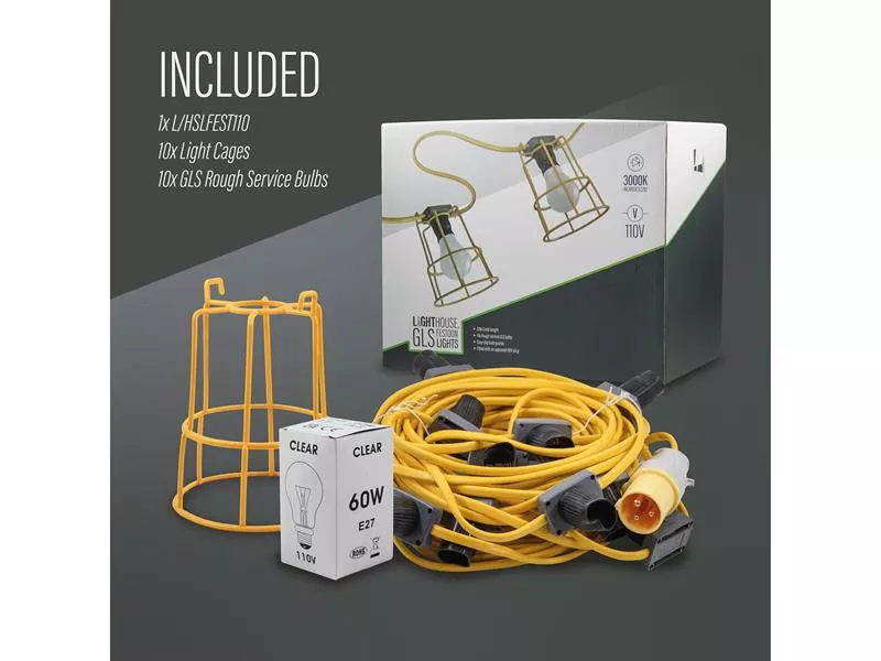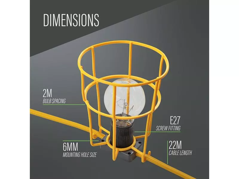 Illuminate large areas effortlessly with Lighthouse Festoon Bulbs, designed to provide bright, shadow-free lighting across multiple locations. This set includes a 22-metre cable fitted with 10x E27 Lamp Holders and supplied with 60w rough service bulbs. Perfect for worksites, outdoor events, and even domestic use, these festoon lights ensure maximum visibility and safety. The bulbs are spaced 2 metres apart and feature screw mounting holes for secure installation.