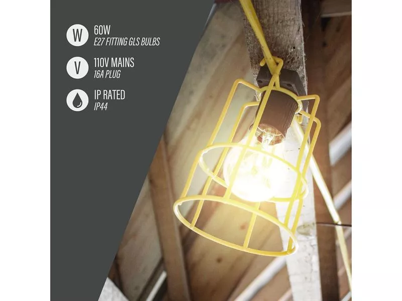 The yellow cable enhances worksite visibility, while the IP44 rating ensures durability and weather resistance. Fitted with a 16 Amp 110 Volt plug, this light set is easy to set up and provides reliable illumination for various applications.