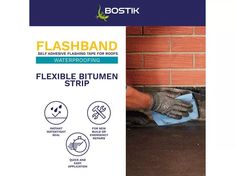 Bostik Flashband is a self-adhesive flashing strip for roofs, giving an instant watertight seal. Excellent adhesion to a wide range of building materials. Quick and easy-to-use, ideal for emergencies.
