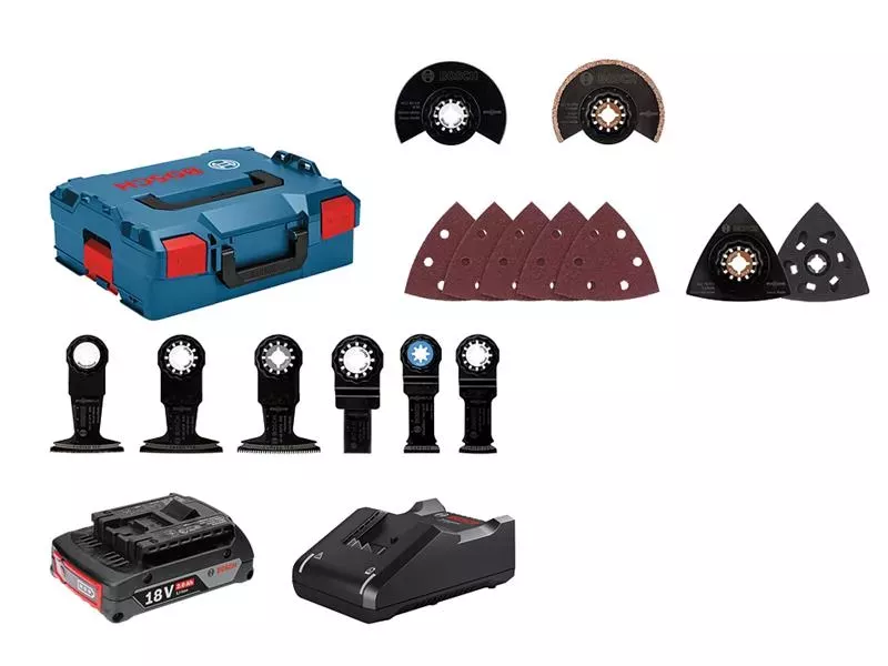 The Bosch GOP 18V-28 Professional Multi-Cutter is intended for furniture cutouts and boat renovations as well as pipe and nail cuttings. It can be used in wood, plastic, and metal. Its superior Starlock interface with an optimised 3-dimensional tight-fitting connection between the machine and accessory delivers the highest possible power transmission for faster working progress. The multi-tool also features an LED spot, illuminating workspaces and improving work visibility even in the dark. Furthermore, its Snap-in function enables fast and easy tool accessory changes.
