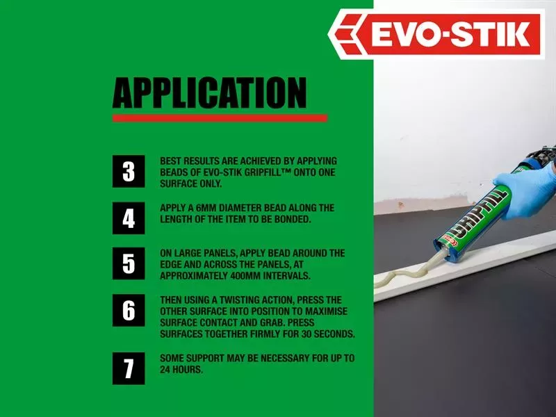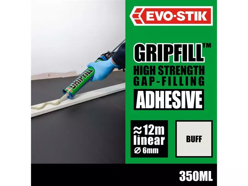Evo-stik Gripfill is a solvent-borne, filled rubber resin adhesive, developed to bond virtually any rigid materials together, regardless of the evenness of the surface. Gripfill is a high strength, one part, gap filling adhesive specially formulated to bond a large variety of materials.