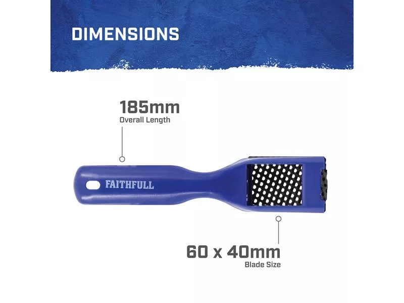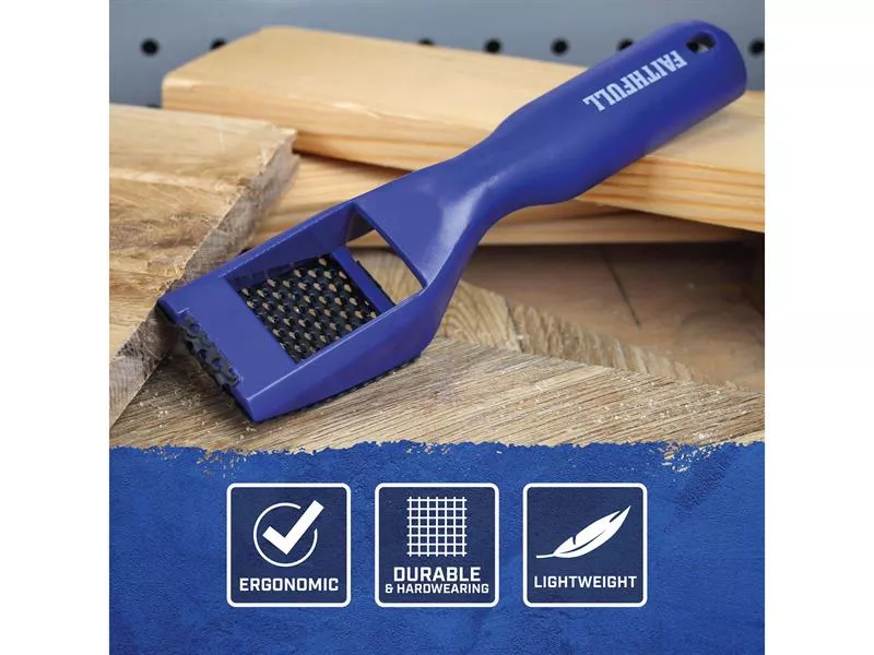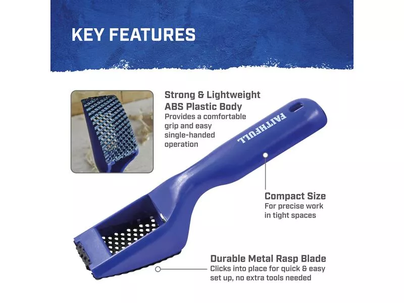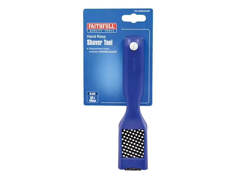 The Faithfull Hand Rasp Shaver Tool is suitable for removing material from all types of wood, aluminium, plastics, fibreglass and laminates. It can also be used for plaster and filler removal. The lightweight and strong ABS plastic body features a small head to allow fast stock removal in confined spaces. The durable metal rasp blade clicks into place, making its replacement tool-free and fast.