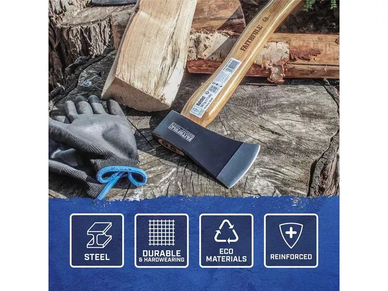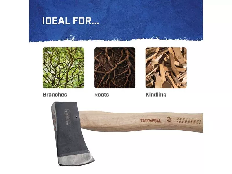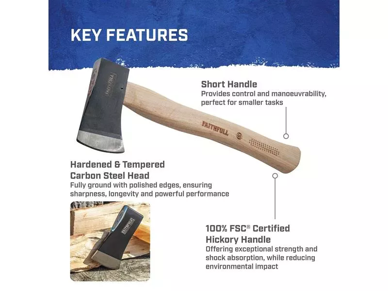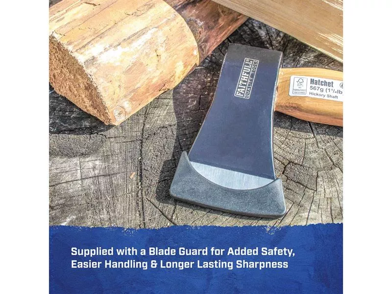 The Faithfull FSC Hickory Shaft Hatchet is ideal for trimming branches and root growth. Manufactured from carefully hardened and tempered quality carbon steel, the head is fully ground with polished cutting edges which are protected by a blade guard. Fitted with a traditional hickory handle which is known for its strength and ability to absorb impact. Made with FSC® 100% Certified Wood from well-managed forests.