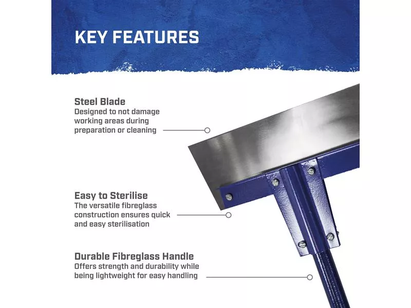 The steel blade is designed not to damage tiled flooring or laminates and is fitted with fibreglass handles for strength and easy sterilisation.