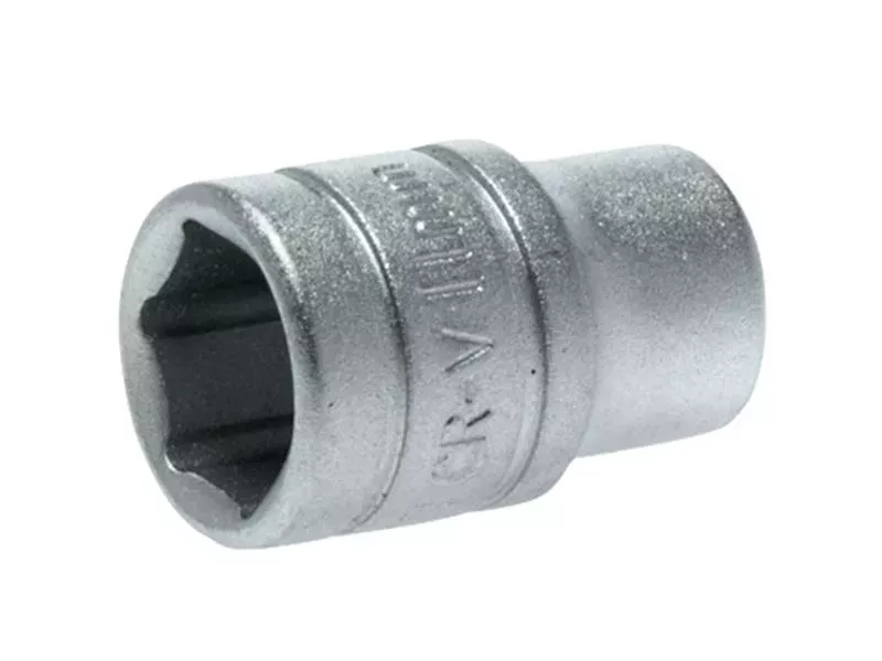 A professional matt chromed 1/4in square drive socket, produced in accordance with ISO 9000 and AS954 specifications, for increased torque and reduced risk of rounding fasteners. This hexagonal socket has a relatively short depth and a stepped collar on the shank.