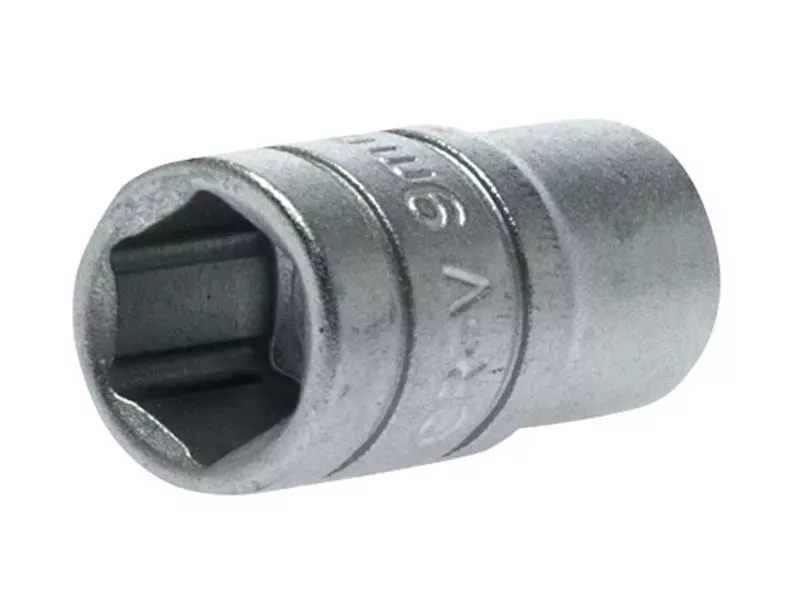 A professional matt chromed 1/4in square drive socket, produced in accordance with ISO 9000 and AS954 specifications, for increased torque and reduced risk of rounding fasteners. This hexagonal socket has a relatively short depth and a stepped collar on the shank.