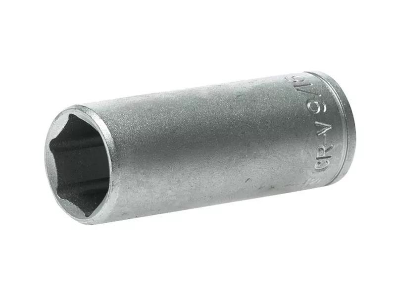 A professional, deep, 3/8in Drive hexagonal AF socket produced in accordance with ISO 9000 and AS954 specifications for increased torque and reduced risk of rounding fasteners.