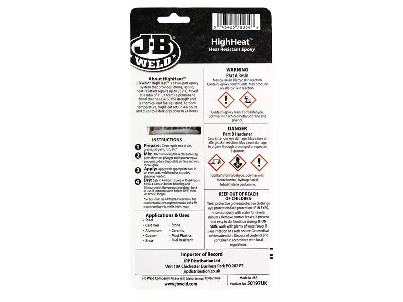 J-B Weld HighHeat™ is a heat-resistant epoxy adhesive for bonding and gap filling substrates exposed to high temperatures up to 260°C (500°F). Resistant to water, chemicals and heat.