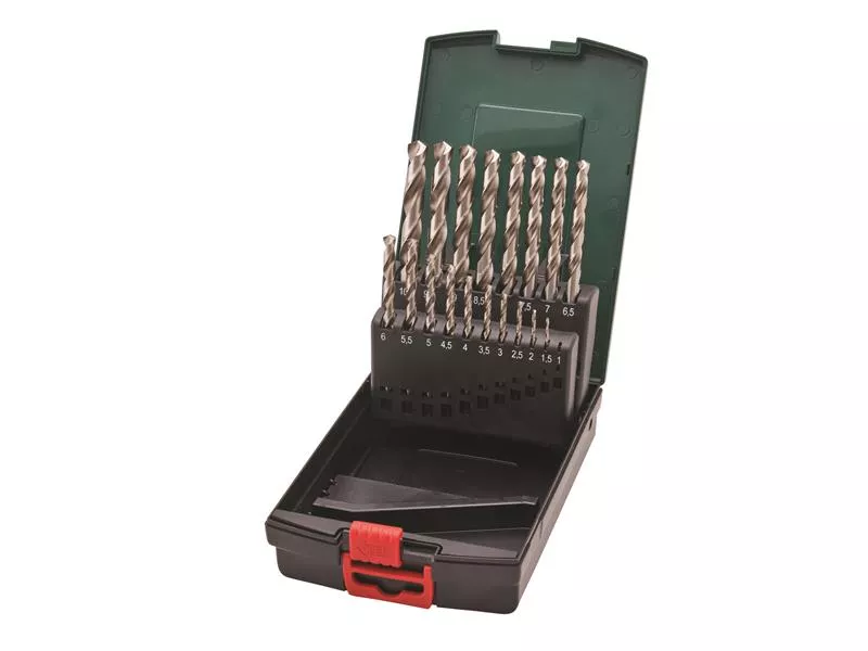 19 Piece Metabo HSS-G Drill Bit Set in a plastic carry case. Contains a selection of HSS-G metal drill bits, DIN 338, type N with 135° crosswise grinding.