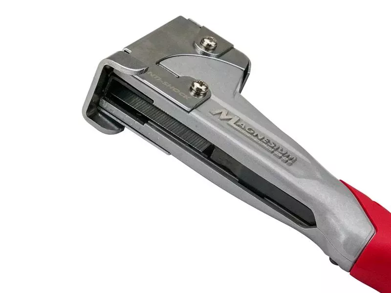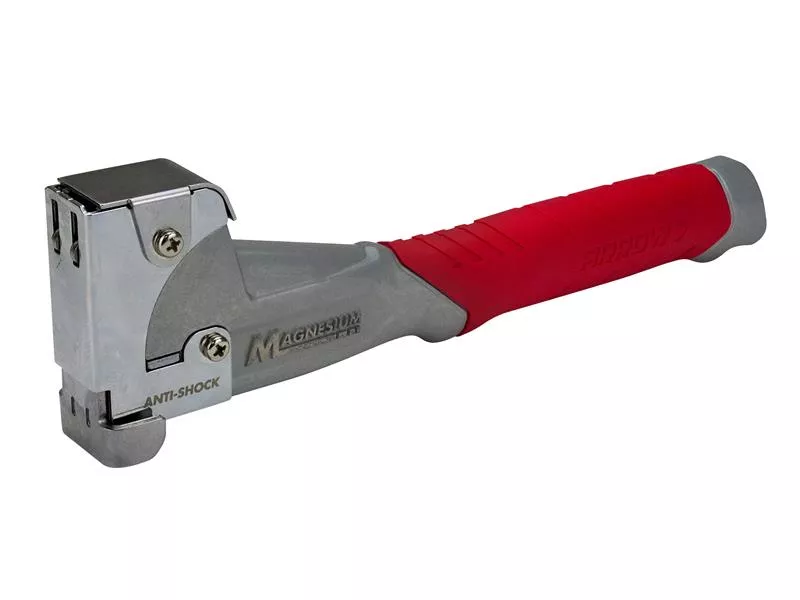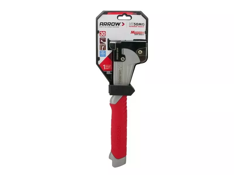 The Arrow AHT50MG Magnesium Hammer Tacker improves on Arrow's classic hammer tacker by increasing durability, and reducing vibrations. The patented design delivers more drive in every staple compared to standard hammer tackers, and will protect your workpiece from dents and scratches. The magnesium body is resistant to corrosion. The shock resistant build will reduce vibrations by 20%, and the rubber handle will give you a firm, comfortable grip.