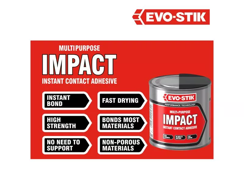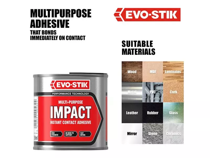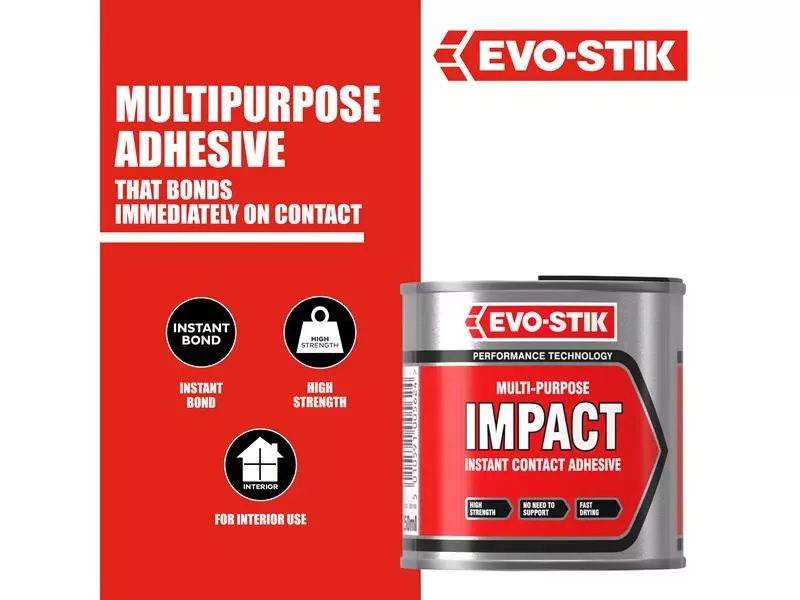 A one-part contact adhesive ideal for numerous jobs around the home and in the workshop. Provides a High strength strong bond on contact without the need for special support, jigs, clamps or weights.