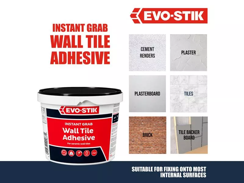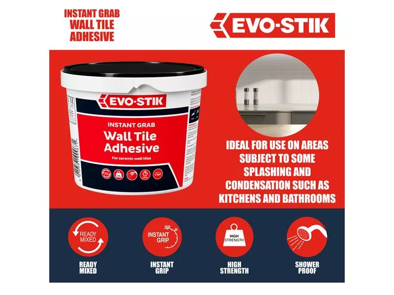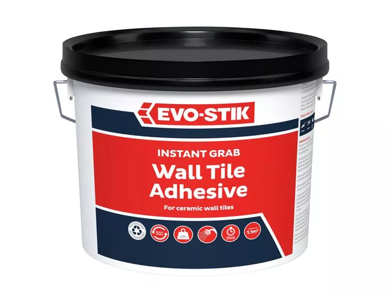 The Evo-Stik Instant Grab Wall Tile Adhesive is for Ceramic Tiles is ready-mixed, easy to use and suitable for fixing ceramic tiles onto most interior walls and backgrounds. It has been tested to EN 12004.