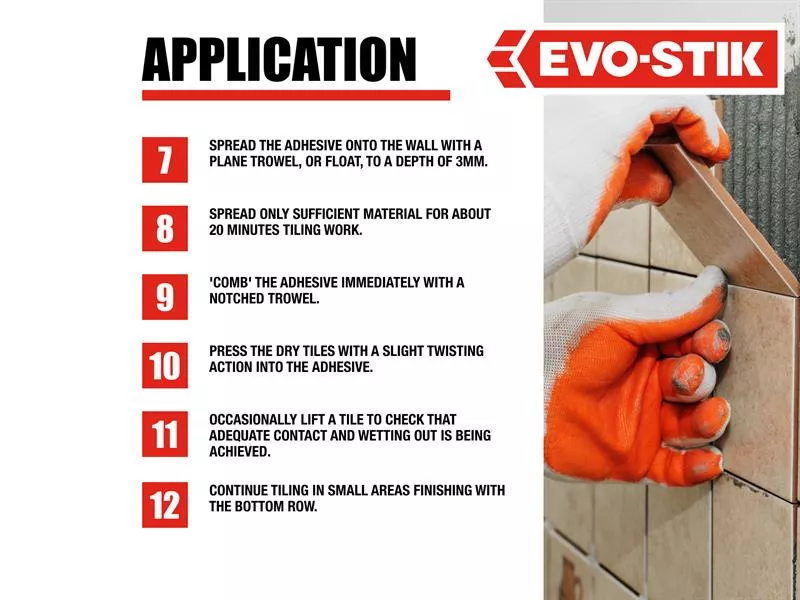 It is showerproof, the thin-bed adhesive is non-slip and suitable for fixing ceramic wall tiles to most types of sound interior surfaces, including cement rendering, plaster, plasterboard, old glazed tiles and glazed bricks.