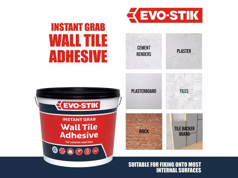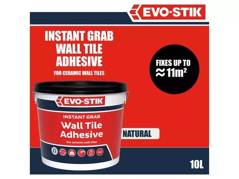 The Evo-Stik Instant Grab Wall Tile Adhesive is for Ceramic Tiles is ready-mixed, easy to use and suitable for fixing ceramic tiles onto most interior walls and backgrounds. It has been tested to EN 12004.
