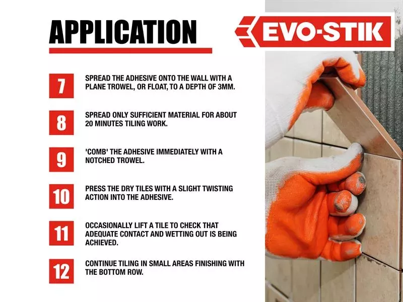 It is showerproof, the thin-bed adhesive is non-slip and suitable for fixing ceramic wall tiles to most types of sound interior surfaces, including cement rendering, plaster, plasterboard, old glazed tiles and glazed bricks.