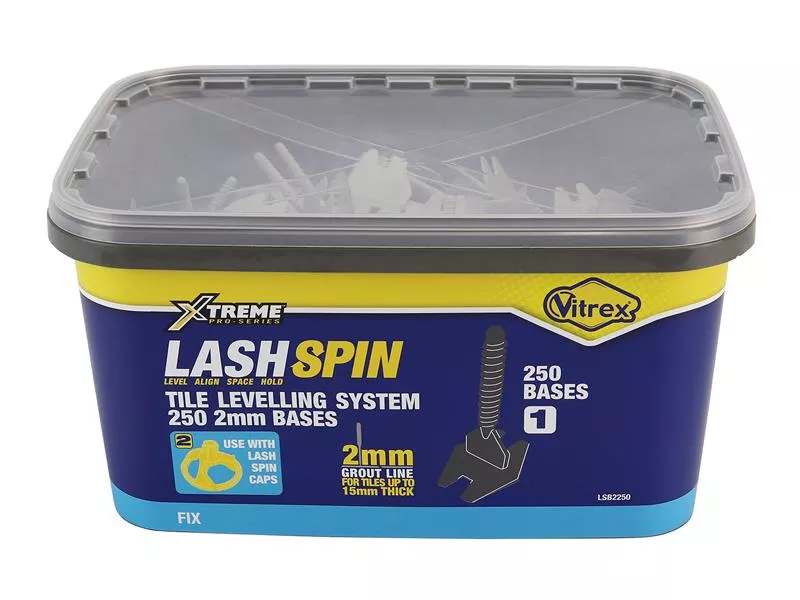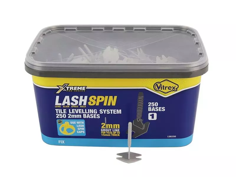 The Vitrex LASHSPIN Tile Levelling System is an enhanced, spin-style version of the original Vitrex LASH system. Featuring a quick-install Spin Cap and interchangeable bases for 2mm or 3mm grout lines, it’s designed for speed, precision, and ease of use. Ideal for large-format tiles, including porcelain, marble, and stone, LASHSPIN completely eliminates tile lippage and ensures a perfectly level finish on both walls and floors.