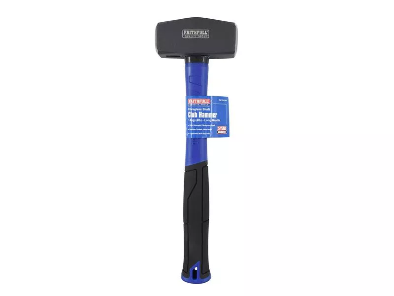 The Faithfull Fibreglass Shaft Club Hammer is meticulously designed to deliver exceptional performance and durability for a variety of tasks. Featuring a 1.8kg (4lb) steel head, this club hammer offers the perfect balance of weight and power, making it ideal for light demolition work and driving masonry nails.