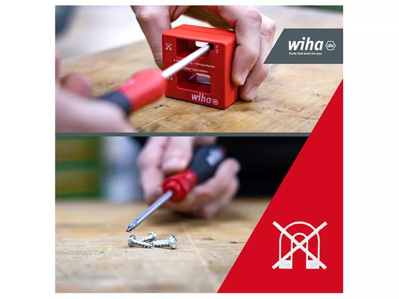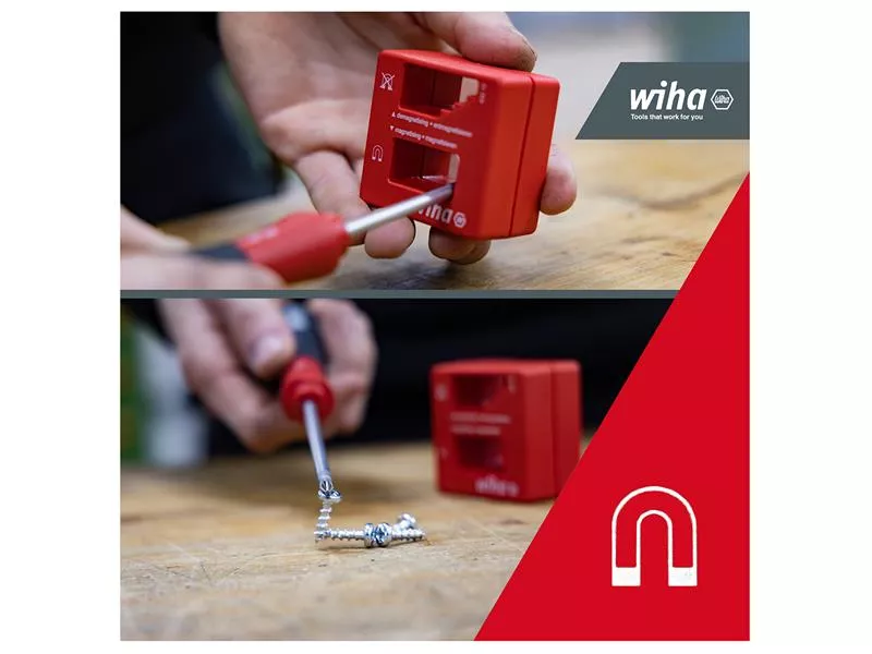 The Wiha Magnetiser/Demagnetiser for magnetising and demagnetising blades and blade-like tools made of steel. The tool's strong permanent magnet has an extremely long service life and is also suitable for magnetising tweezers and other steel tools.