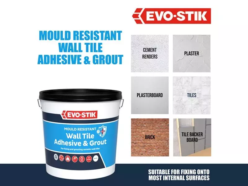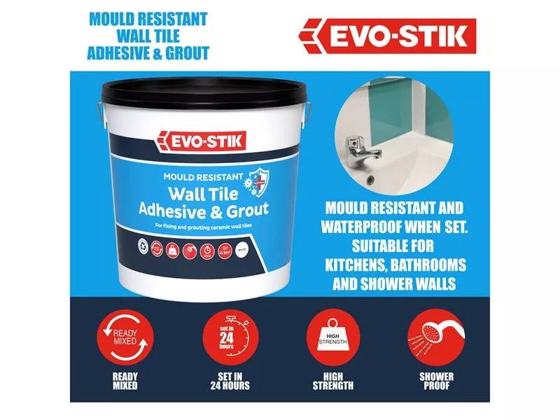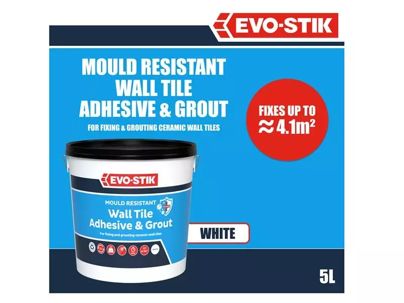 The Evo-Stik Mould Resistant Wall Tile Adhesive and Grout is an easy to use, brilliant white ready-mixed ceramic wall tile adhesive and grout. It is mould resistant and waterproof when set and complies with EN 12004 (equivalent to BS5980 Type 2 Class AA).