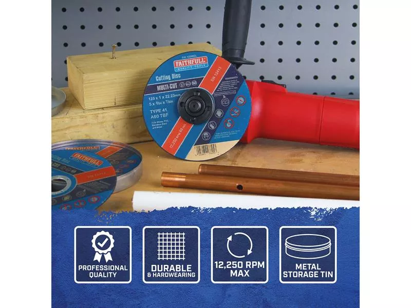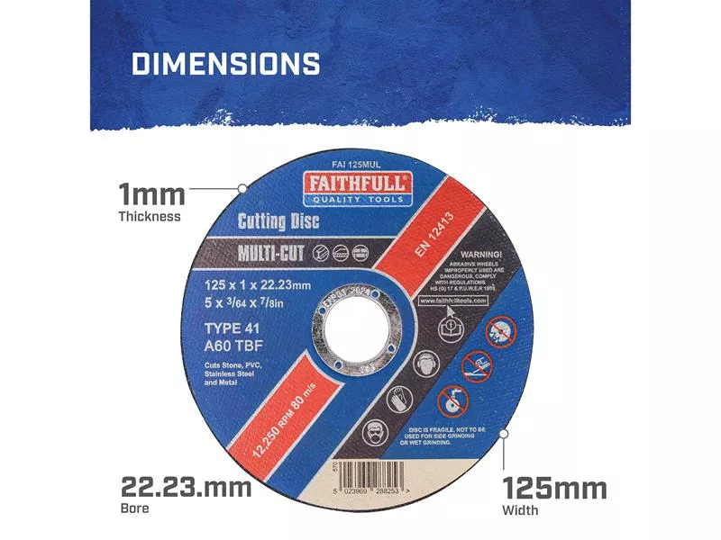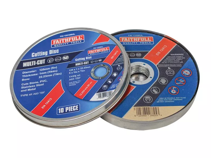 The Faithfull Multi-Cut Cutting Discs will cut a wide range of materials used in the construction and fabrication industries. At only 1mm thick they are able to provide a fast cutting action with less waste and dust. Multi-Cut discs solve the problem of cutting several different materials at once and are ideal for cutting modern-day composite materials used throughout industry. Will cut sheet metal, stainless steel (inox), pipes and profiles, brick, stone, ceramic tiles and other building materials along with plastics/ PVC.