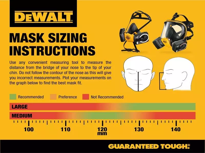 DEWALT Reusable Full Mask Respirator with P3 filters. Provides protection in workplaces which have high incidences of fine dust, lead, silica, MDF particles, or other forms of industrial pollutants in the air.