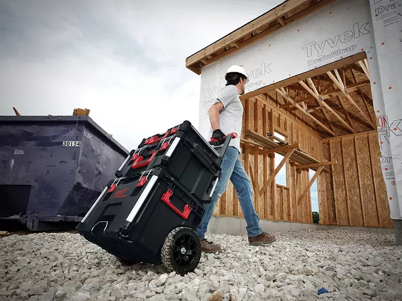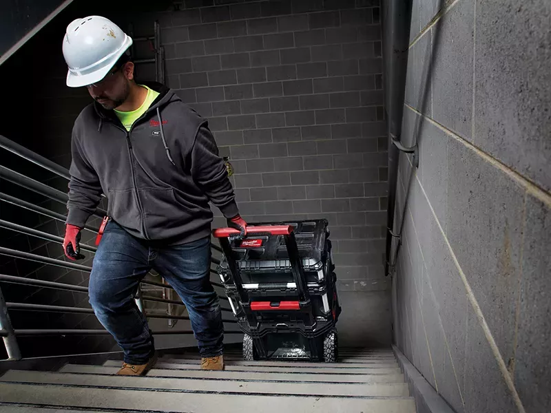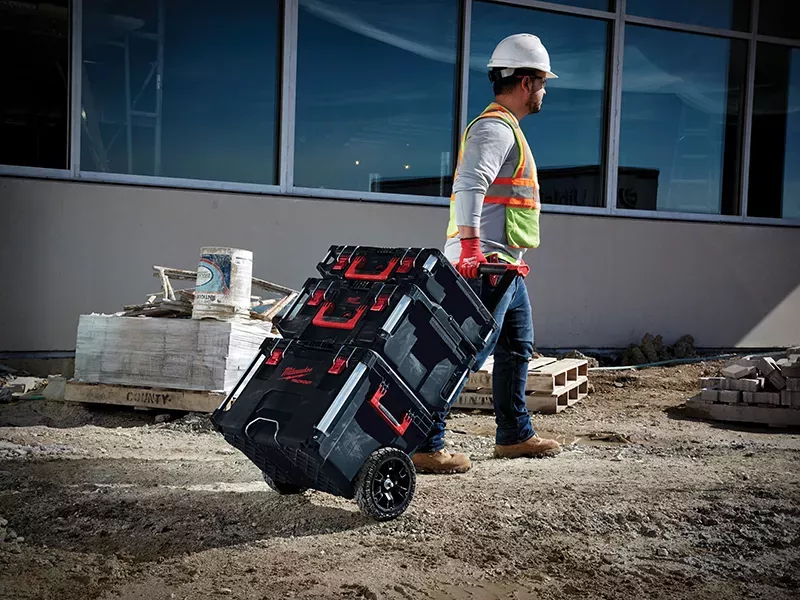 The Milwaukee Hand Tools PACKOUT™ Trolley Set contains a selection of cases constructed from impact-resistant polymers for jobsite durability. With reinforced metal corners and locking points.