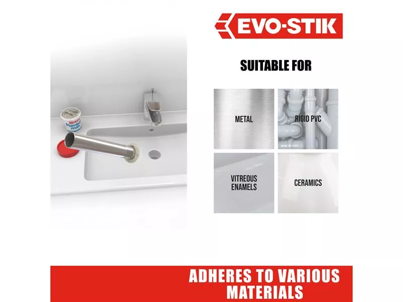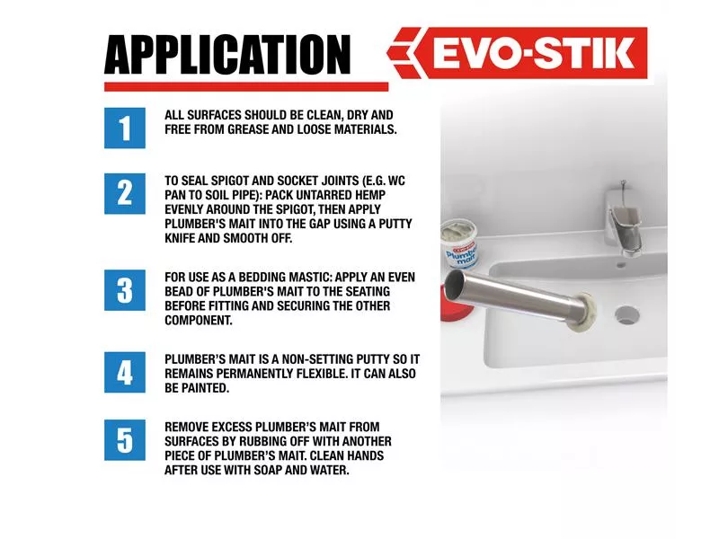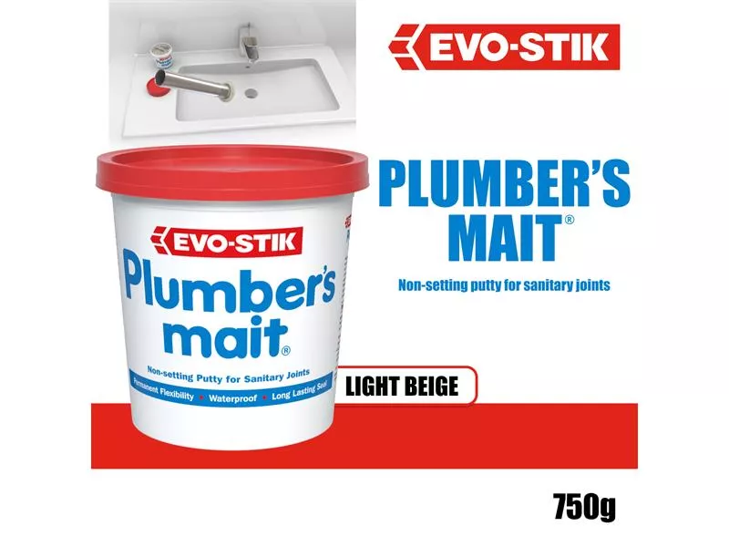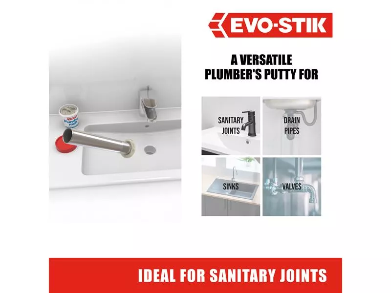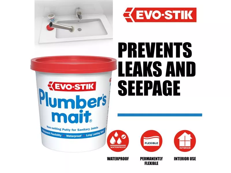 Evo Stik Plumber's Mait®, a waterproof non-setting, non-cracking putty for use in sanitary installations. It provides a watertight seal that can be overpainted. Permanent flexibility allows for joint movement.