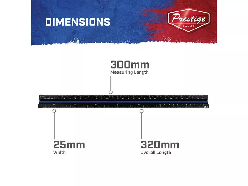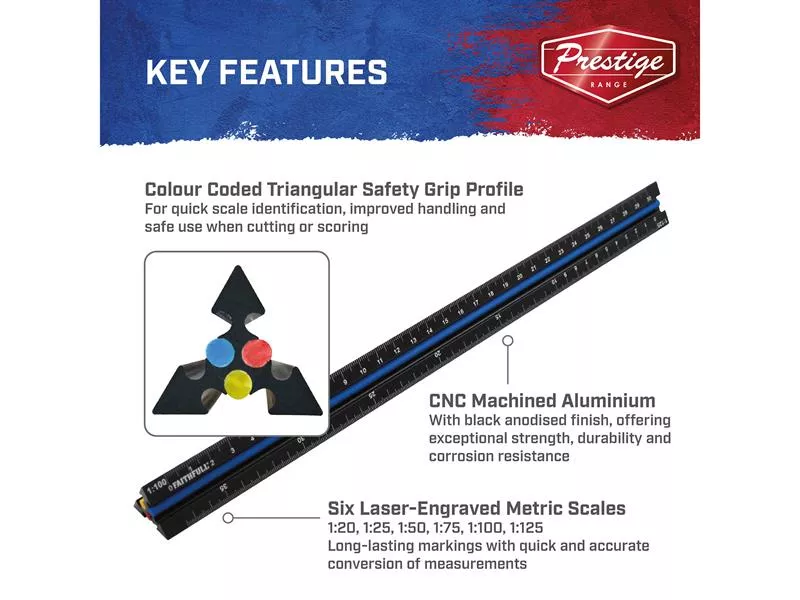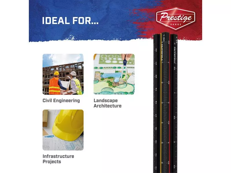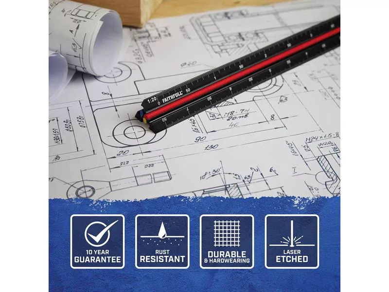 The Faithfull Prestige Tri-Scale Engineer and Architect Rules are commonly used to convert ratios with scales when making precision drawings. This model features 6 scales that can be easily recognised thanks to the colour coded inserts. The unique triangular profile keeps fingers away from knife blades when used for cutting or scoring card etc.