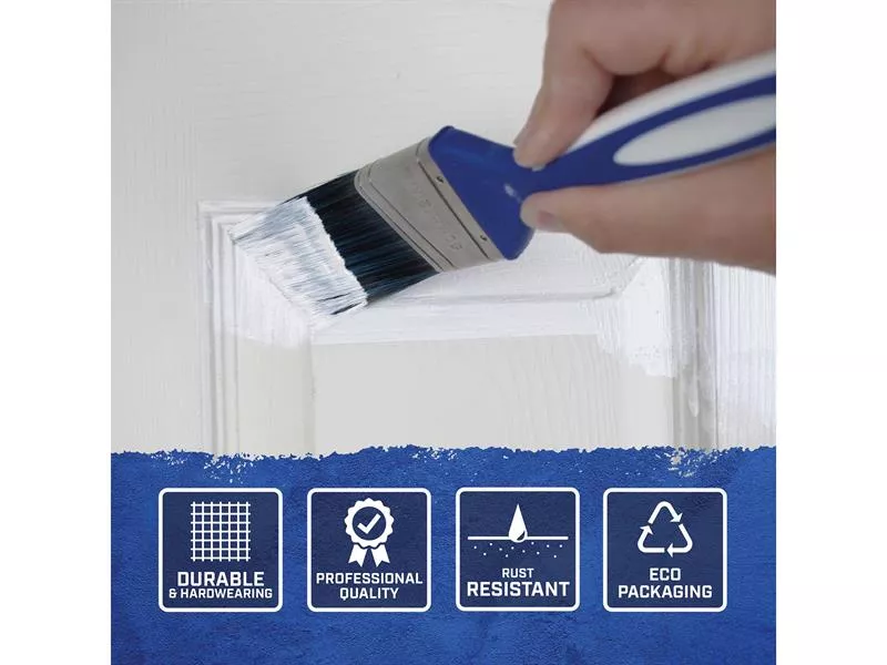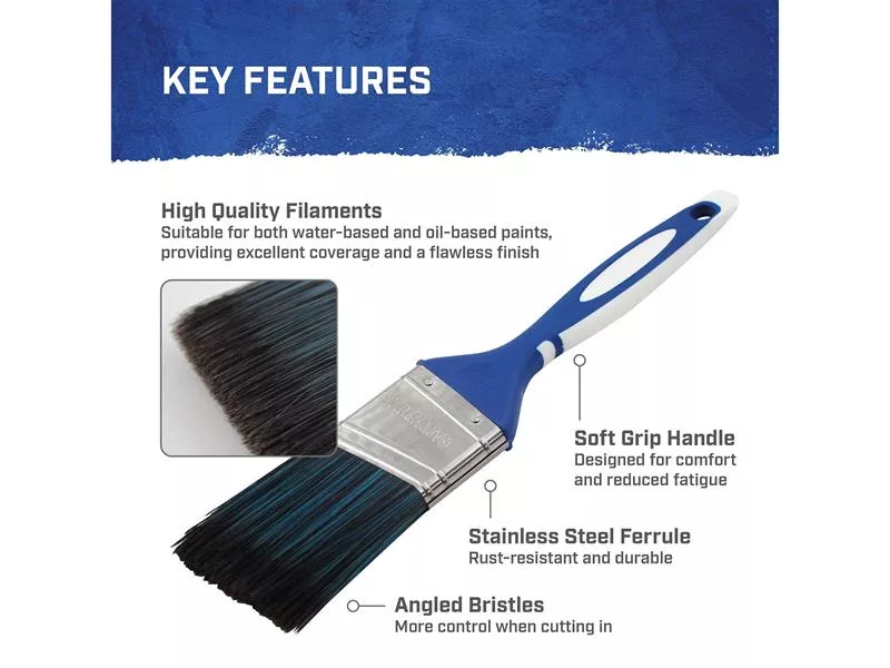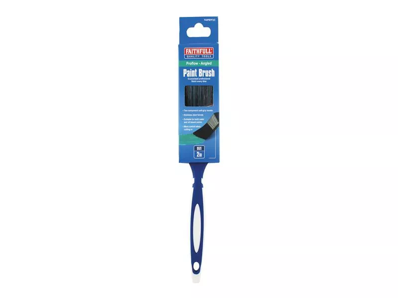The Faithfull Proflow Angled Paint Brush is designed for both amateur decorators and professional painters. Made with a blend of high-quality synthetic filaments, it ensures excellent paint pick-up and a smooth, even release onto any surface. The carefully designed filament length and specially treated tips guarantee a professional finish every time, whether you’re using water-based or oil-based paints. The angled head is designed to give more control when cutting in.