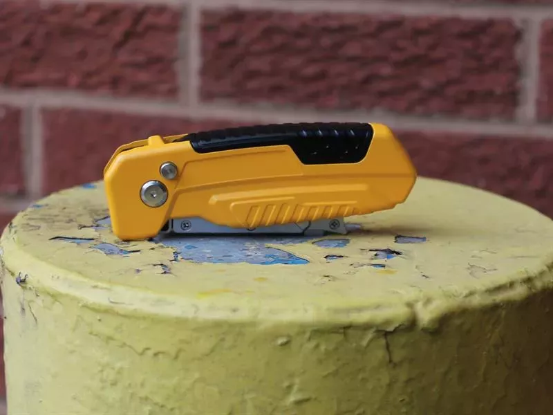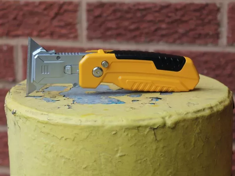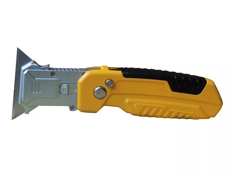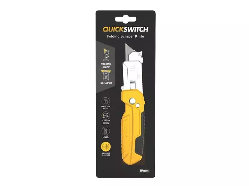 The Advent QuickSwitch Folding Knife functions as a standard utility knife and a scraper. The knife's body features a compartment to store extra blades. Other features include a safety lock button and an adjustable locking position.
