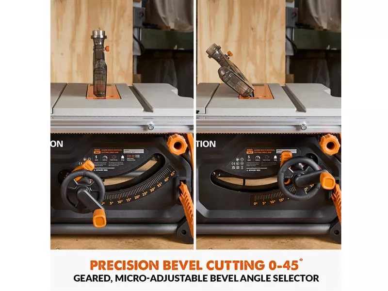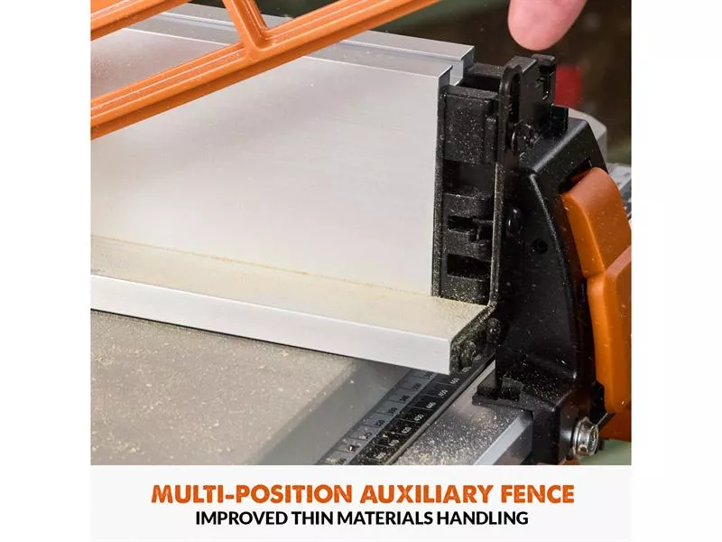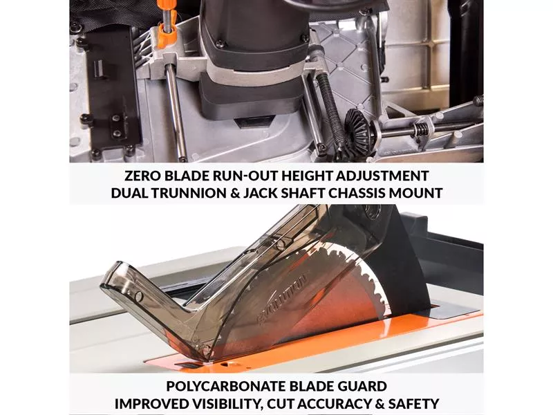 It features a dual rack & pinion rip-fence for accurate, repeatable cuts. A gear-driven blade height and angle adjustment mechanism makes repeat cuts easy and accurate. Our patented Blade-to-Rip-Fence Parallelism Adjustment allows for perfectly aligned cuts in full-size sheets with no binding or kickback. The R255TBL also features a metal throat plate with corner height adjustment as standard, there's no plastic here.