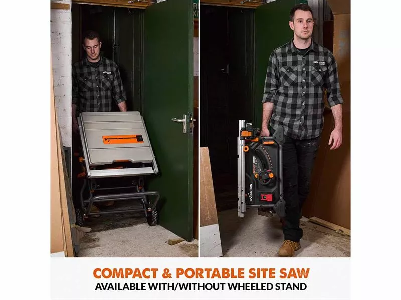 This R255TBL Table Saw is more portable. Mounted within a light, roll-cage chassis, with integral carry handles. It’s an easy one man carry without the wheeled stand. Superbly mobile thanks to the included folding stand, fitted with large all-terrain wheels. It easily passes straight through a standard width internal door (32in) making it the perfect jobsite saw.