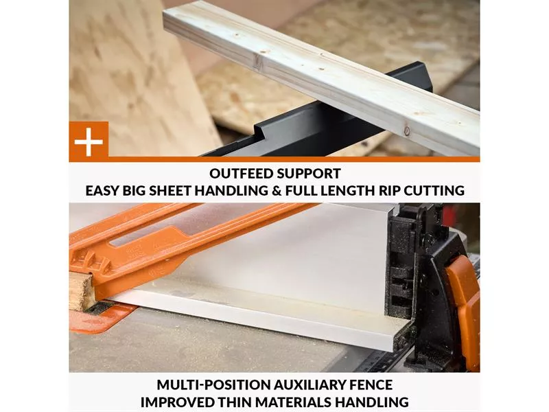 The powerful 1,800W motor features soft-start, electronic blade brake, motor overload protection and a paddle style emergency stop. The blade guard offers improved cut visibility, and the quick release riving knife design features offset angle and lateral adjustment for easier and safer cutting, especially when handling full size boards. The new motor housing offers improved dust extraction , better access for cleaning, and blade swaps are easier than ever before.