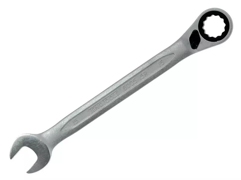 This Teng Tools ratcheting combination spanner combines an open ended spanner with a 72-tooth 12-point ring ratchet. The ratchet has a 'flip reverse' feature, which switches the direction of the ratchet, and it is offset at a 13° angle for ease of access.