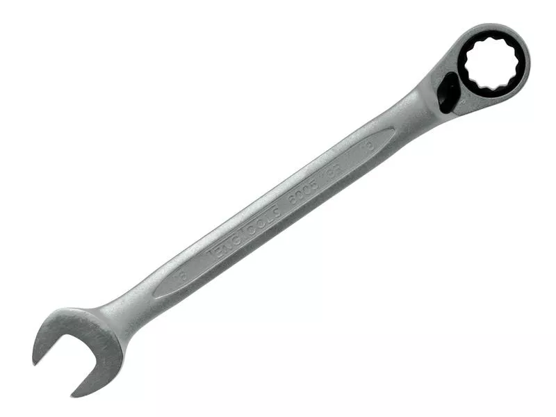 This Teng Tools ratcheting combination spanner combines an open ended spanner with a 72-tooth 12-point ring ratchet. The ratchet has a 'flip reverse' feature, which switches the direction of the ratchet, and it is offset at a 13° angle for ease of access.