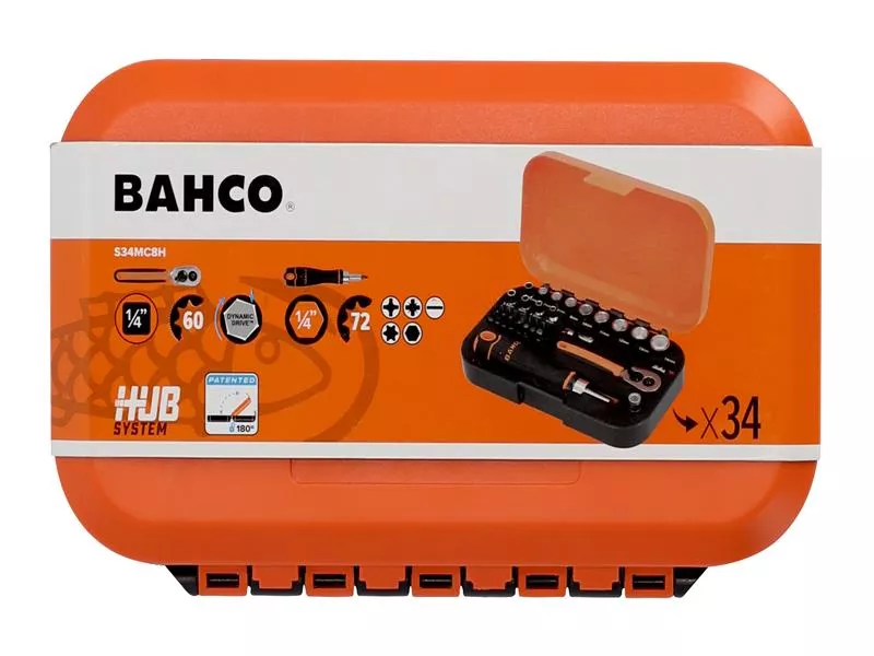 The Bahco S34MC8H 1/4in Drive Socket & Bit Set, contains sockets made from high performance 50BV30 alloy steel with a micro matt finish. Conforms to ISO 1174 and DIN 3120. Supplied in a durable ABS plastic case. Contains: