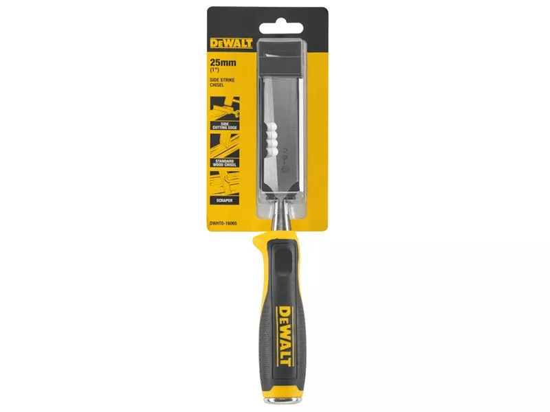 The DEWALT® Side Strike Chisel can be used for demolition and scraping. It's tempered carbon chrome steel blade and hardened strike cap make this a durable tool designed to last. A cutting edge on the side of blade allows for demolition work and also allows the chisel to double as a scraper. Fitted with an ergonomically designed bi-material handle for comfort and protection.
