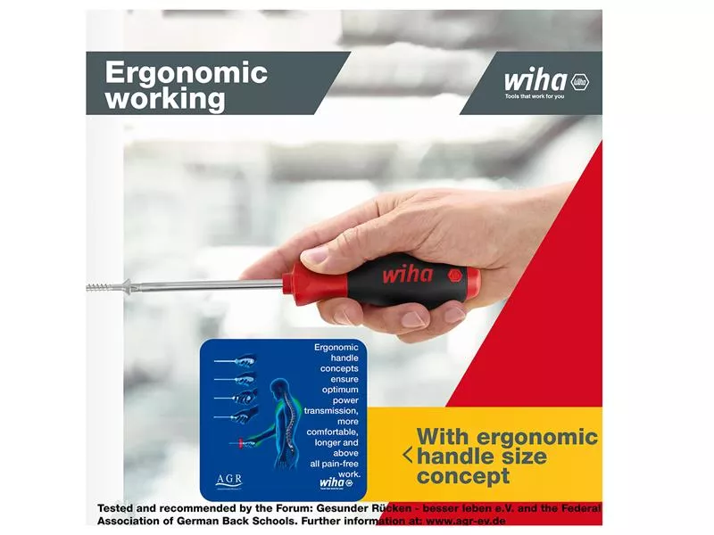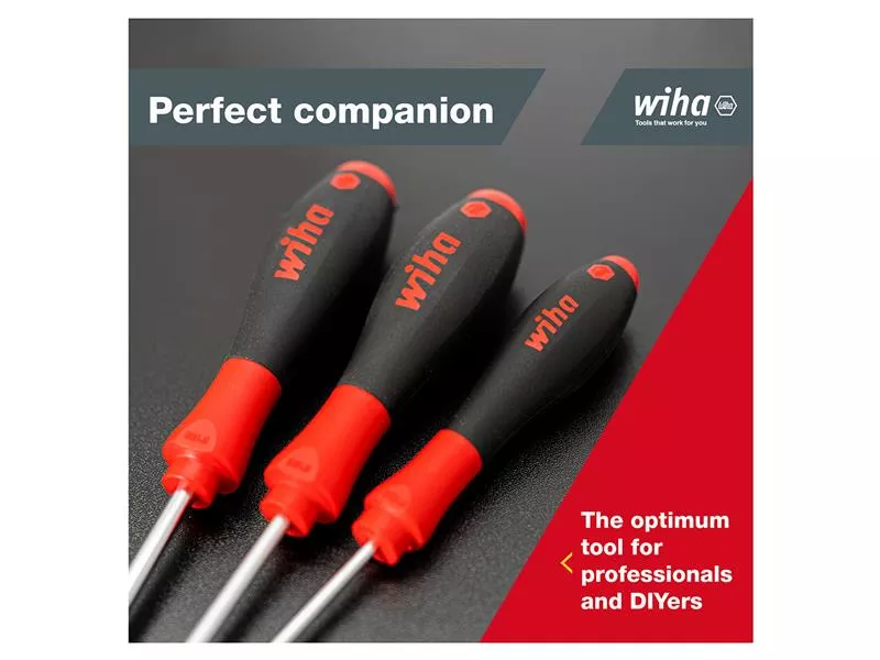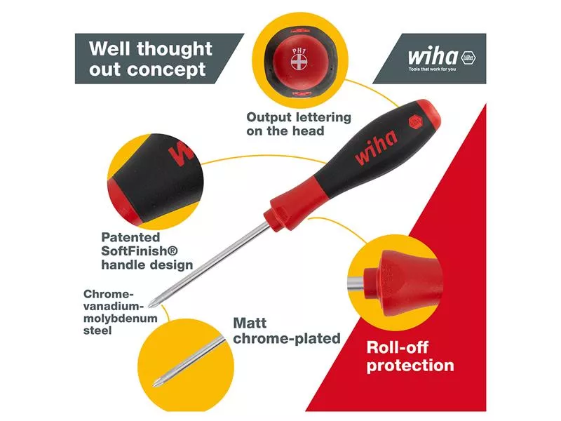 The Wiha SoftFinish® Screwdrivers come with a round Chrome vanadium steel blade, matt chrome plated. A patented SoftFinish® handle ensures work is kind to hands and muscles. Recommended by doctors and therapists at the German Campaign for Healthier Backs. The unique Wiha handle-length concept provides optimum balance of torque and control.